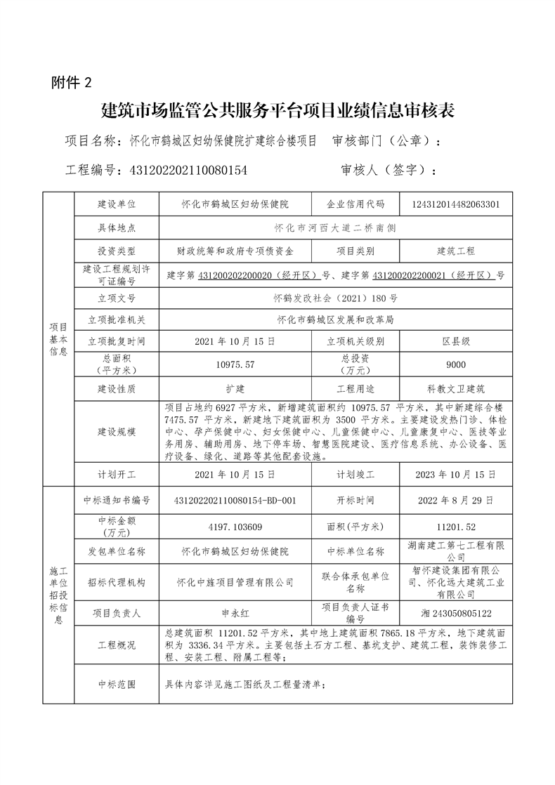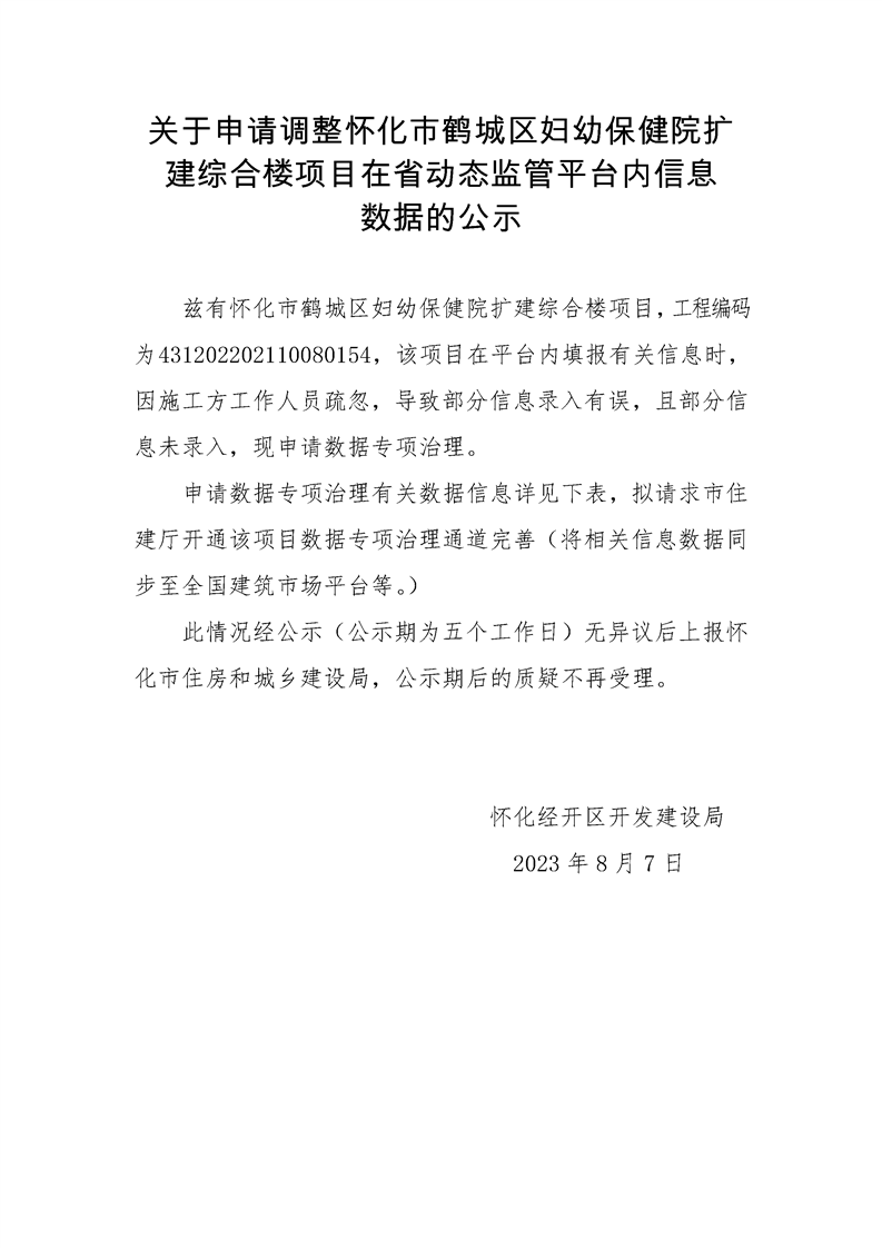关于申请调整怀化市鹤城区妇幼保健院扩建综合楼项目在省动态监管平台内信息数据的公示