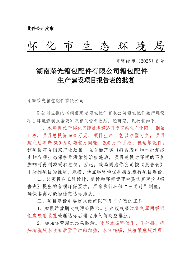 湖南荣光箱包配件有限公司箱包配件生产建设项目报告表的批复
